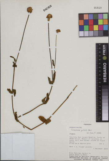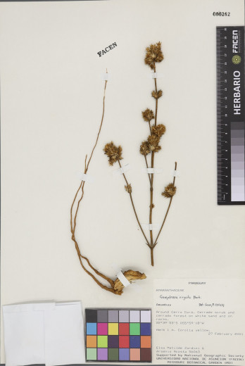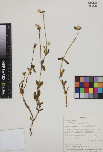 | 960 | Amaranthaceae | Gomphrena | celosioides | Mart. | Elsa Matilde Zardini & Robert Gomez Cabrera | 58194 | Paraguay | Alto Paraguay |
