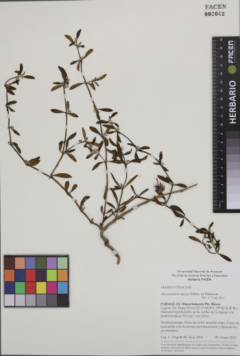 | 2042 | Amaranthaceae | Alternanthera | kurtzii | Schinz ex Pedersen | C, Vogt y M. Vera | 1010 | Paraguay | Presidente Hayes |